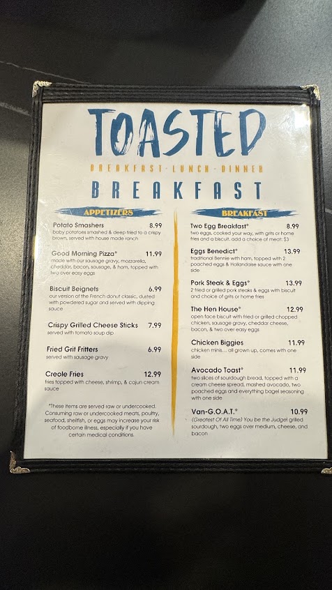 The Toasted Restaurant menu offers a delicious selection of Southern comfort food favorites in Columbus, Georgia. Known for its welcoming atmosphere and freshly prepared dishes, Toasted serves hearty breakfast options, flavorful lunch plates, and classic American Southern specialties. From homestyle favorites to signature menu items, guests can enjoy quality ingredients, generous portions, and affordable pricing. Whether you’re dining in or grabbing takeout, the Toasted Restaurant menu delivers satisfying meals for every occasion.